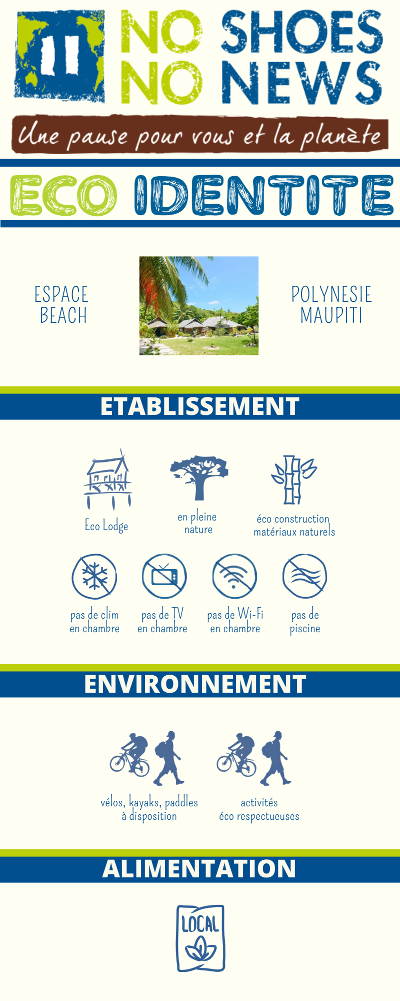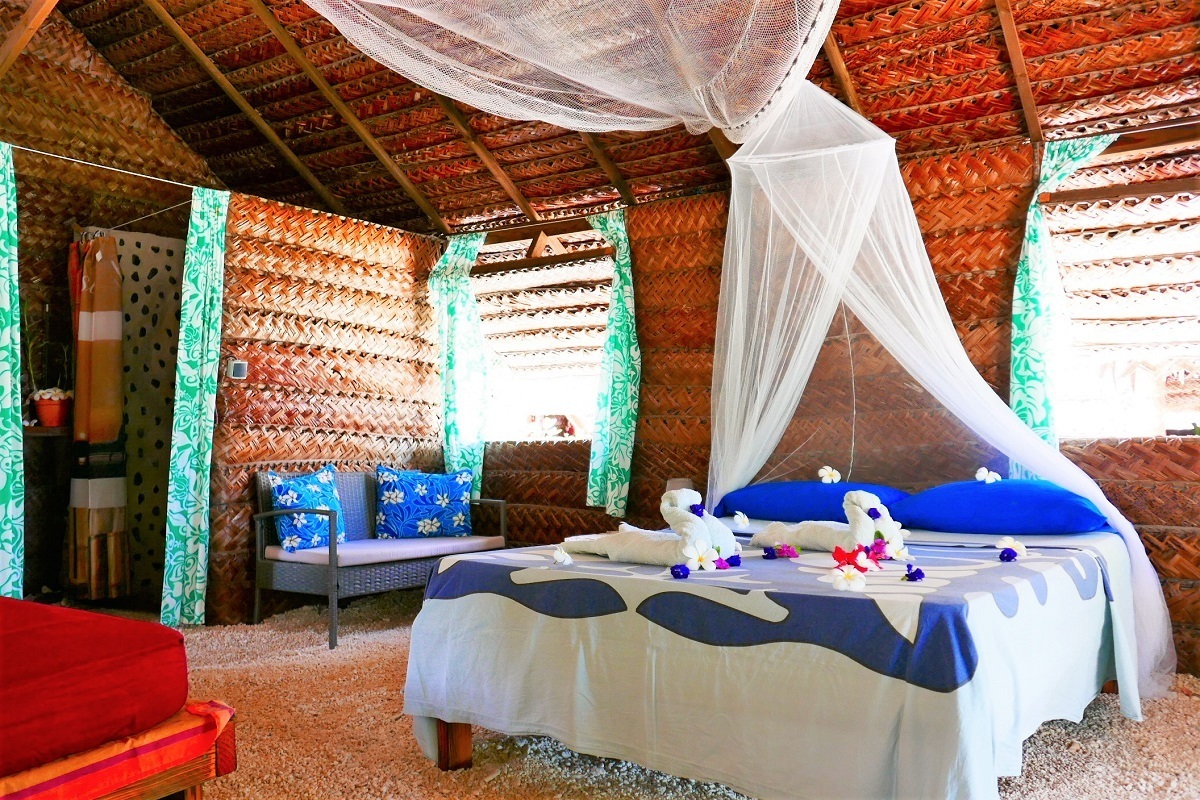 Située sur l’une des plus belles plages de l’île principale de Maupiti à savoir la plage Tereia, la pension Espace Beach Maupiti propose 3 bungalows construits dans la plus pure tradition polynésienne : murs et toiture en palme de cocotier tressée, soupe de corail au sol, décoration intérieure locale et colorée….