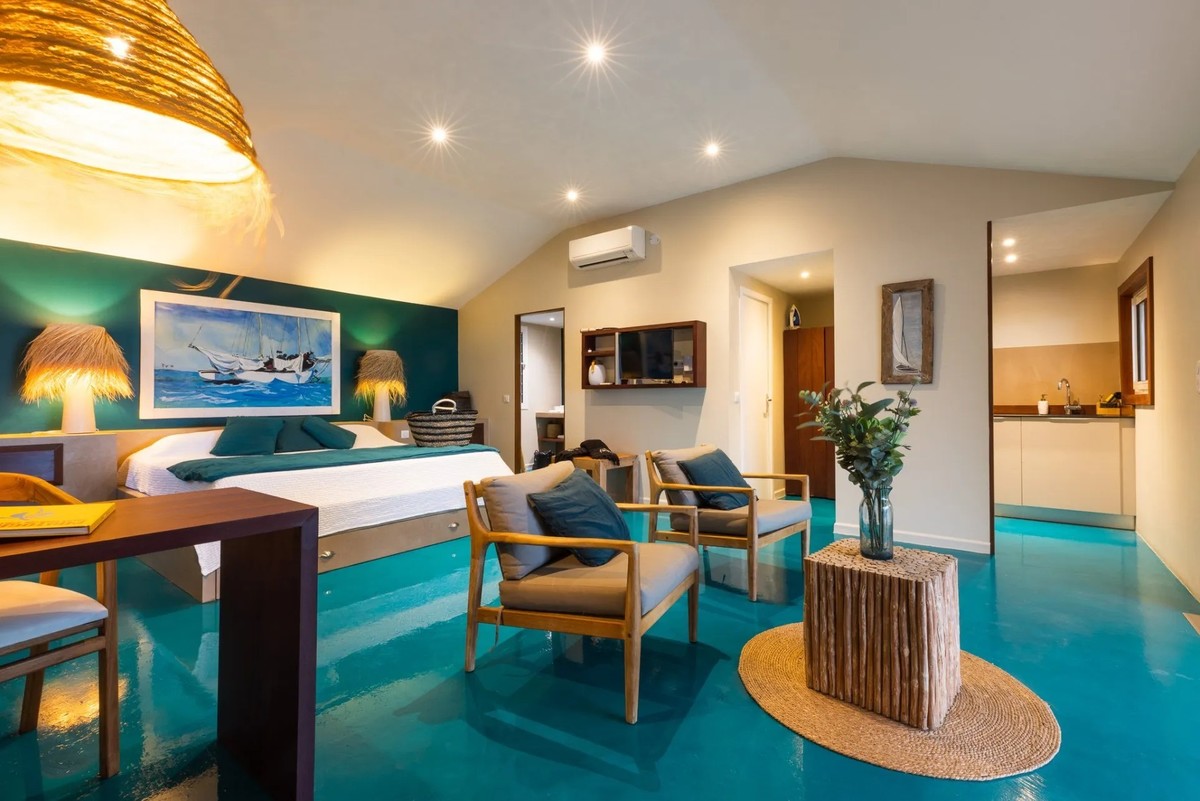salle d'eau avec douche à l'italienne, climatisation, lit King Size + un "lit tiroir" pour la 3ème personne, sèche cheveux, télévision avec application de streaming, accès Wi-Fi, cuisine équipée, minibar, terrasse amenagée avec hamac, tables , fauteuils et chaises longues.