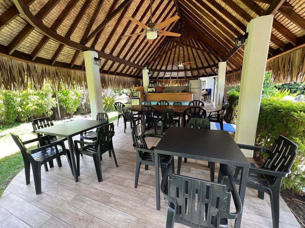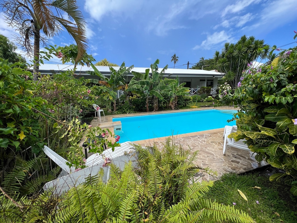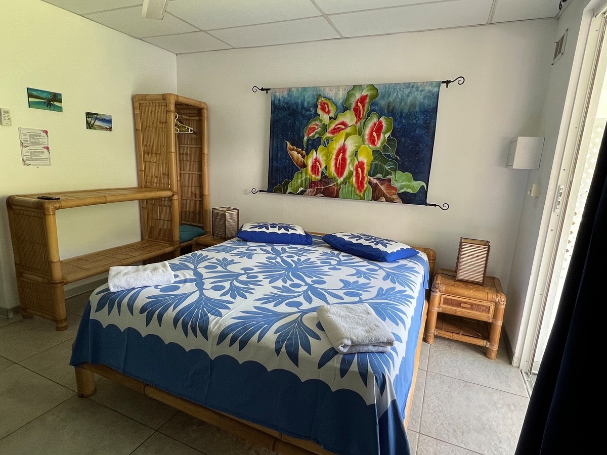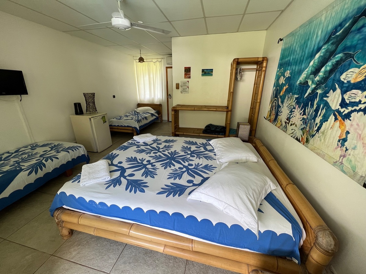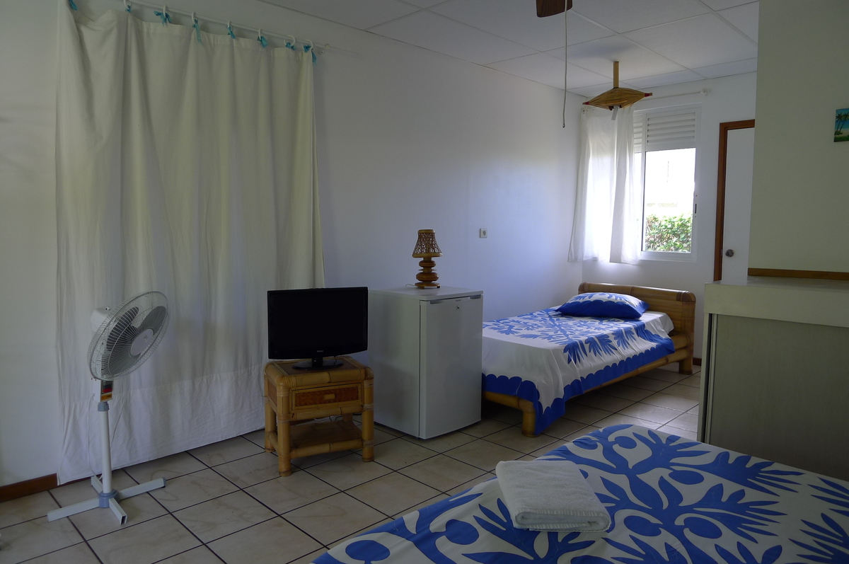 Les chambres sont spacieuses et bien équipées : grand meuble de rangement, petit réfrigérateur, télévision à écran plat, meubles en bambou...Elle peut accueillir confortablement 4 personnes dans un décor coloré : couvre-lit "tifaifai" typiquement tahitien, tableau aux motifs exotiques créés spécialement pour la pension...