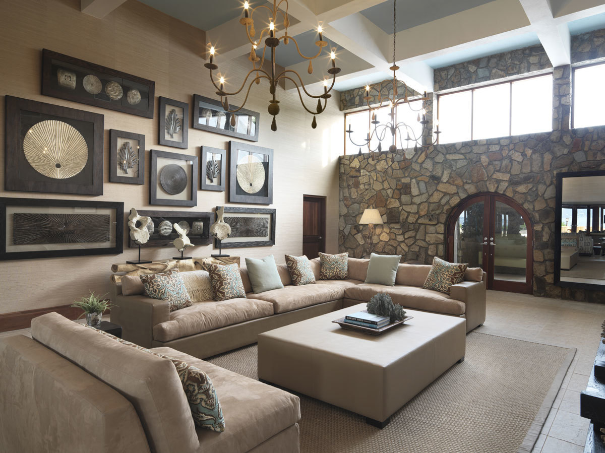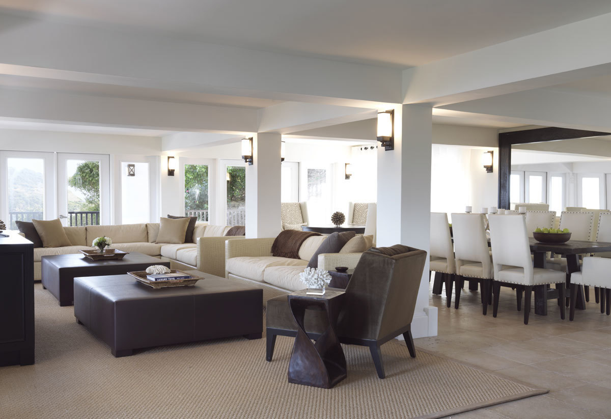 Villa ouverte avec salle à manger, salon, salle des média, centre de fitness, cuisine équipée.