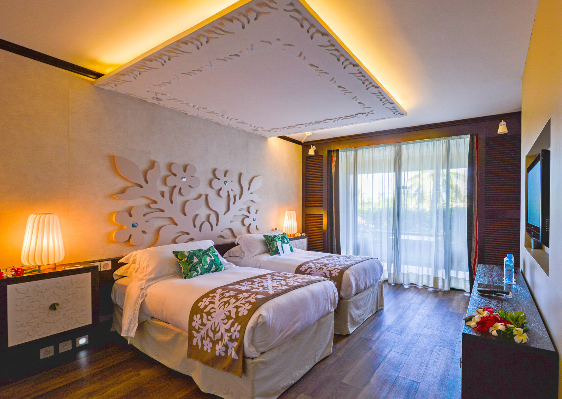 Chambres modernes et lumineuses, de style polynésien plus épuré, équipées d’1 lit king-size ou de 2 lits jumeaux, d'une salle de bain avec douche à l’italienne.
