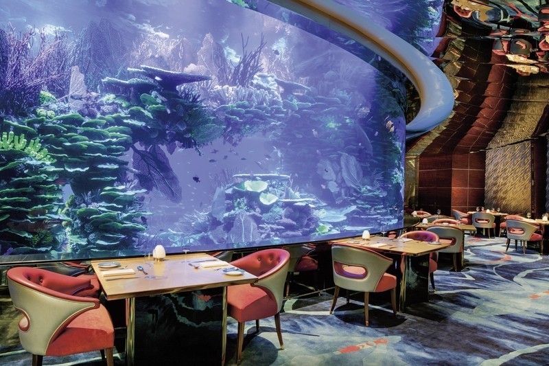 Le Burj Al Arab dispose de 7 restaurants et 5 bars, dont son célebre Sky bar à 200m au dessus de la mer offrant une vue à couper le souffle sur le golf persique et Dubaï . Le lobby gigantesque vaut à lui seul le détour, avec des immenses aquariums où nagent des poissons du monde entier et des jeux d'eau dans des fontaines pouvant atteindre 42 m de haut.