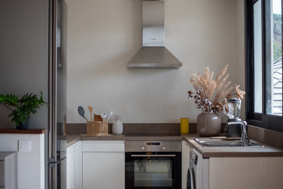 - Cuisine équipée (four, plaque de cuissons, hotte, réfrigérateur) avec lave-linge