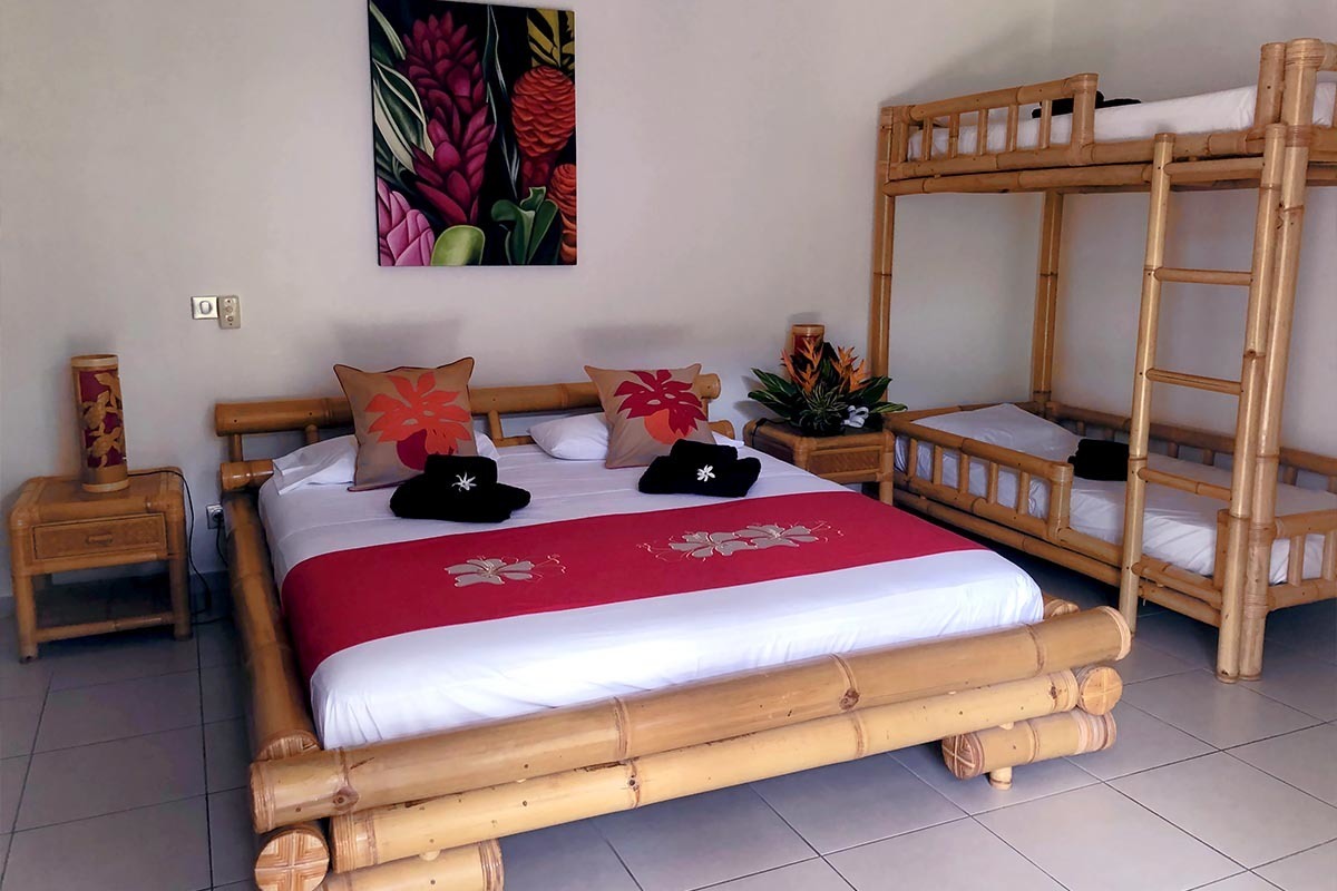 Les chambres standards climatisées sont joliment équipées de meubles en bambous, ainsi que de sympathiques décorations murales donnant un univers accueillant et reposant. Ces chambres climatisées ont vue sur le jardin de la pension