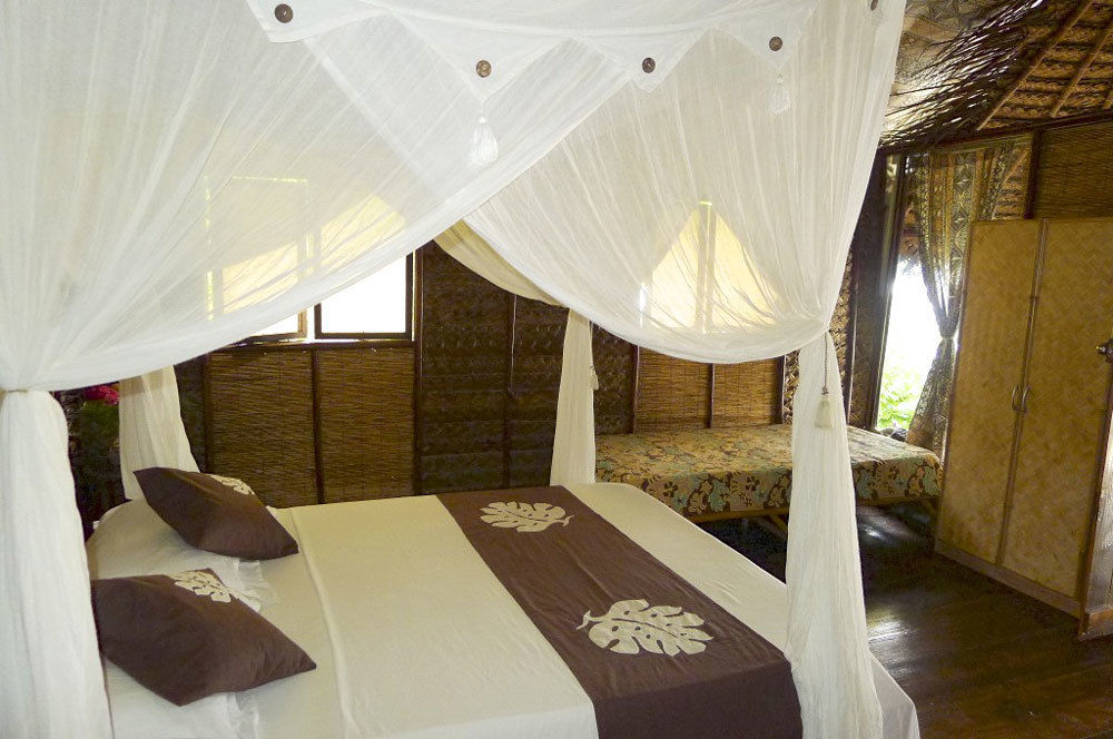 Salle d’eau privée avec douche, eau chaude, électricité, lit confortable, mobilier en bois et moustiquaire, terrasse aménagée donnant soit sur le jardin tropical soit sur le lagon, diffusant anti-moustique, service ménager journalier.